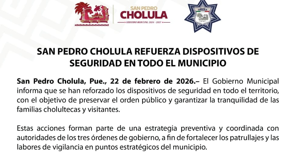 El Gobierno Municipal de San Pedro Cholula, encabezado por la presidenta Tonantzin Fernández, refrenda su compromiso de seguir fortaleciendo la seguridad en las juntas auxiliares mediante operativos estratégicos que contribuyan a la prevención del delito y a la protección de las familias cholultecas.