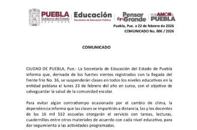 Con la llegada del frente frío 36 a Puebla, se prevé que se registren lluvias de fuertes a muy fuertes, así como descenso de las temperaturas en los municipios de las sierras Norte, Nororiental y Negra, ante este fenómeno climático, la Secretaría de Educación Pública del Estado informa que habrá suspensión de clases el lunes 23 de febrero en escuelas de Educación Básica y Media Superior de la región.